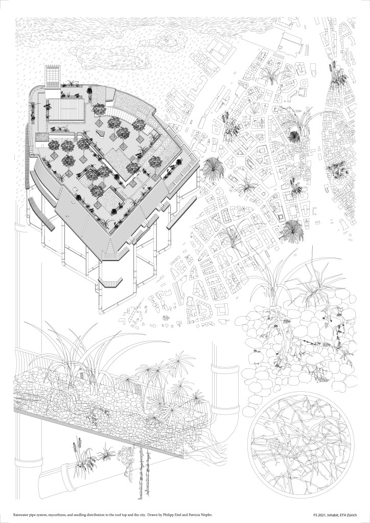 Both the shell space and the roof are inhabited by plants. On the roof we create an elevated green space for the city. We use the huge roof area to collect rain water and distribute into a net of pipes going through the shell. In the pipes we grow seedlings using hydroponic methods. We introduce a mycorhizzal nutrient system, which create a network between the roots and reduce the amount of artificial fertilizers. The seedlings grown in the pipes are eventually transferred to the roof or are distributed into other green spaces throughout the city.