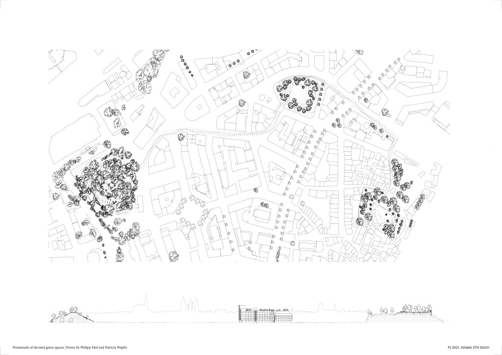 Looking at the city scale, we embed the Jelmoli into a larger network of natural habitats for plants and animals. Our green roof top and promenade becomes part of a larger promenade in the city between the Old botanical garden and the Lindenhof. The roof of the Jelmoli has about the same height as the old botanical garden and the Lindenhof, and constitutes as third space along this promenade of elevated green spaces in the city.