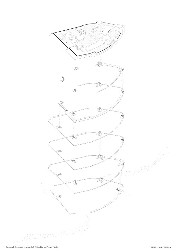 The width of the shell space and created two different kinds of rooms, a wide and a narrow room. The wide room is open to the public, and windows can be opened. The narrow room is accessible only for maintenance. The wide rooms build a promenade from ground level to the roof using the existing outer stair cases. The promenade encircles the building once by moving up one level each time a stair case is crossed.